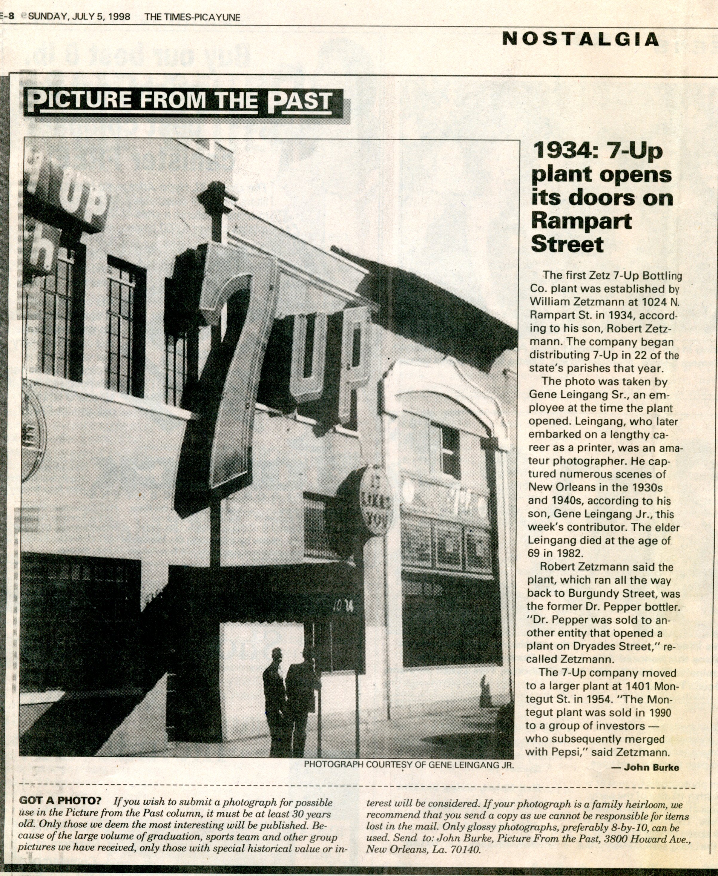 Zetz 7up was born in 1934 and started on N. Rampart Street. Today, WWL Channel 4 occupies this building. Zetz 7up outgrew this facility and moved to Montegut Street in 1954. Zetz 7up was sold in 1990.